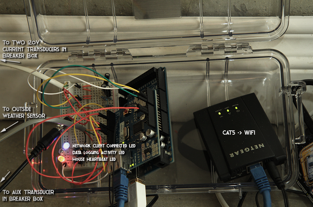 The Arduino interfaces with the electrical panel via 3 clamp-on current transducers. One around each of the two 120V feeds, and the third around the wire feeding my Chevy Volt's power outlet in the garage. By monitoring