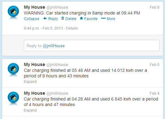 the car seperately I can get accounting data for just how much 'juice' the car pulls from the wall each night. It also allows me to send myself detailed tweets every morning when the car is done charging, and it'll also